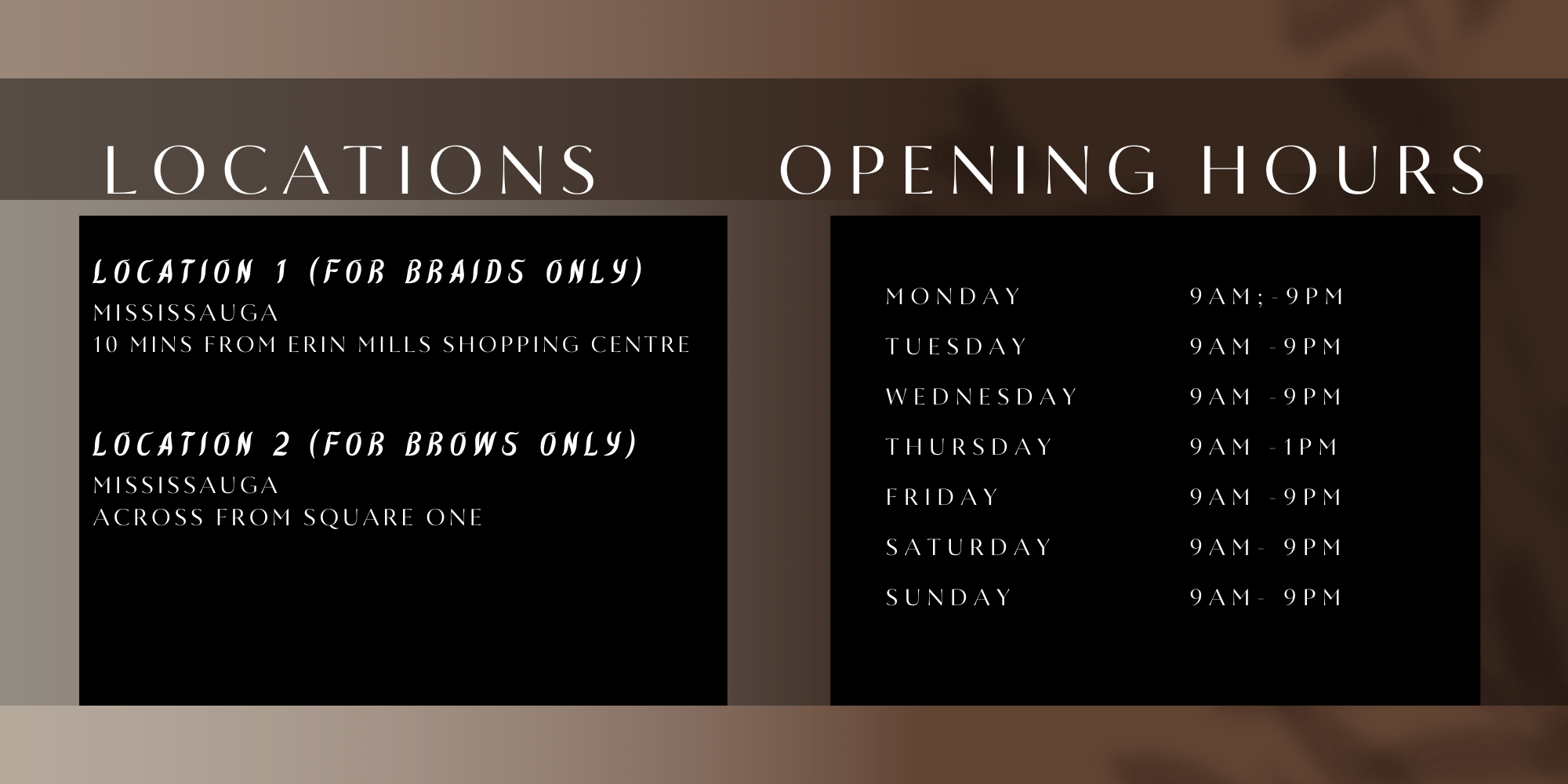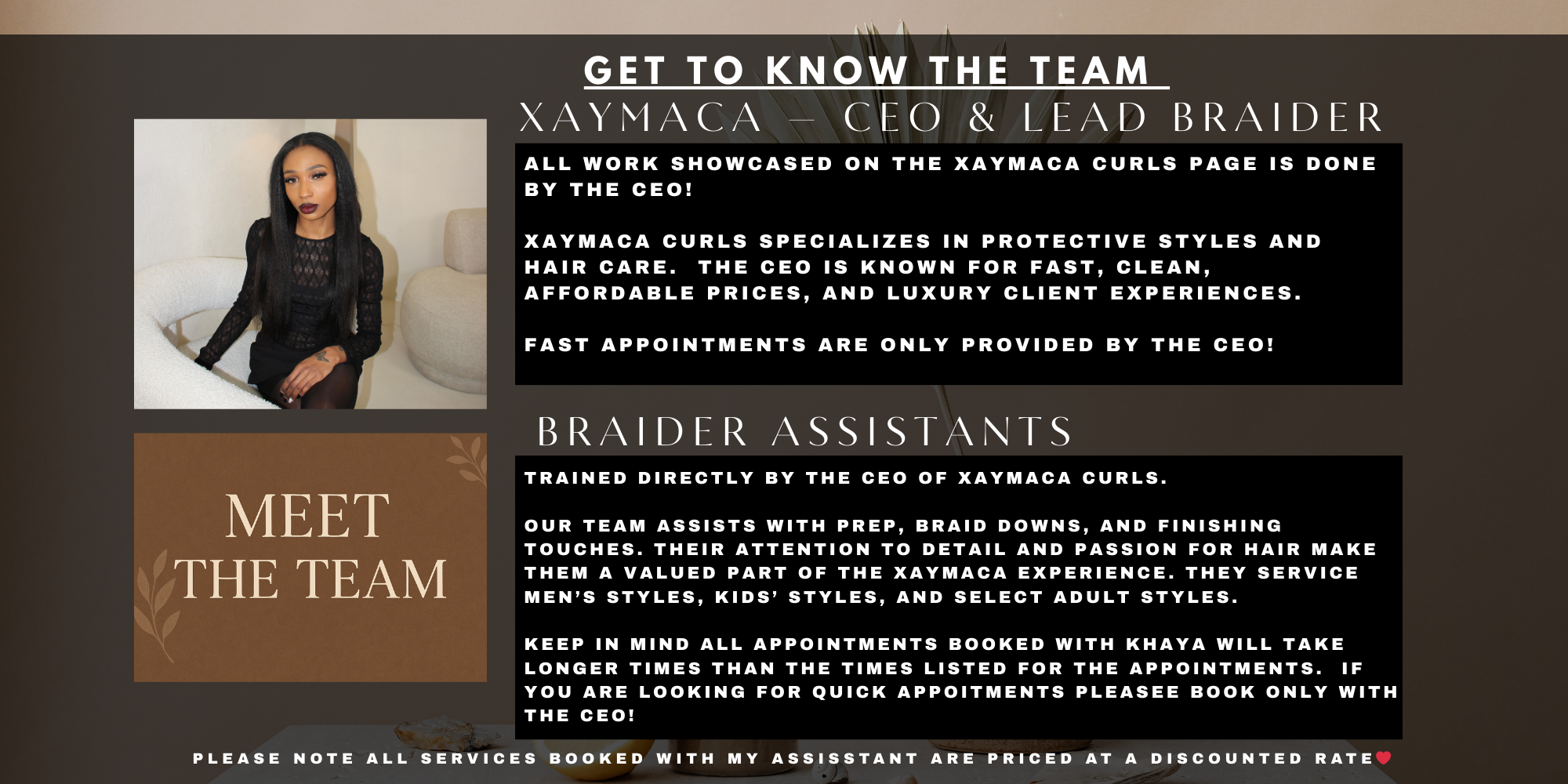 PLEASE NOTE ALL APPOINTMENTS BOOKED WITH MY ASSISTANT BRAIDER WILL BE LONGER APPOINTMENT TIMES THAN THE CEO TIMES THAT ARE LISTED. PLEASE BE PREPARED TO SIT FOR A LONGER SESSION!